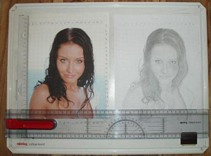 If like me you are using a drawing board this is a lot quicker as you will already have a ruler marked out on your drawing board. You can also use the slide rule to line up your reference points. Once done, and you are happy that your dots are in the right place and that you now know where the hair is located begin to carefully join the dots together. Just like doing Dot to Dot.