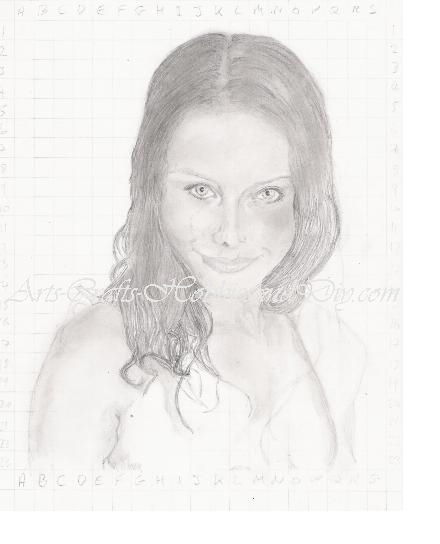 Tip: If when you have finished drawing the shoulders and blending the body you have difficulty locating where the hairline is and where to add it. Use a ruler to lightly re-plot the hairline. First, using your reference picture, measure from the line of your grid where your numbering and alphabet are located. Measure as far across or down your picture as you need to, to pick a prominent point. For example, pick where the hair ends or curves at its widest point. By placing your ruler along the visible lines outside of the portrait area, mark the points on your portrait with a light dot.